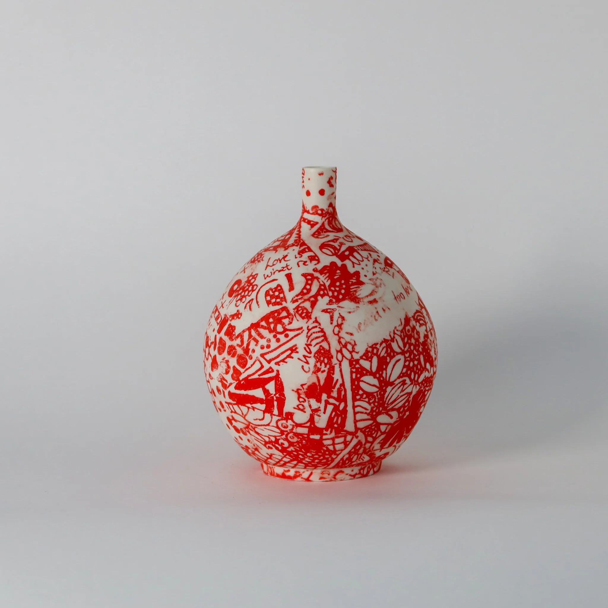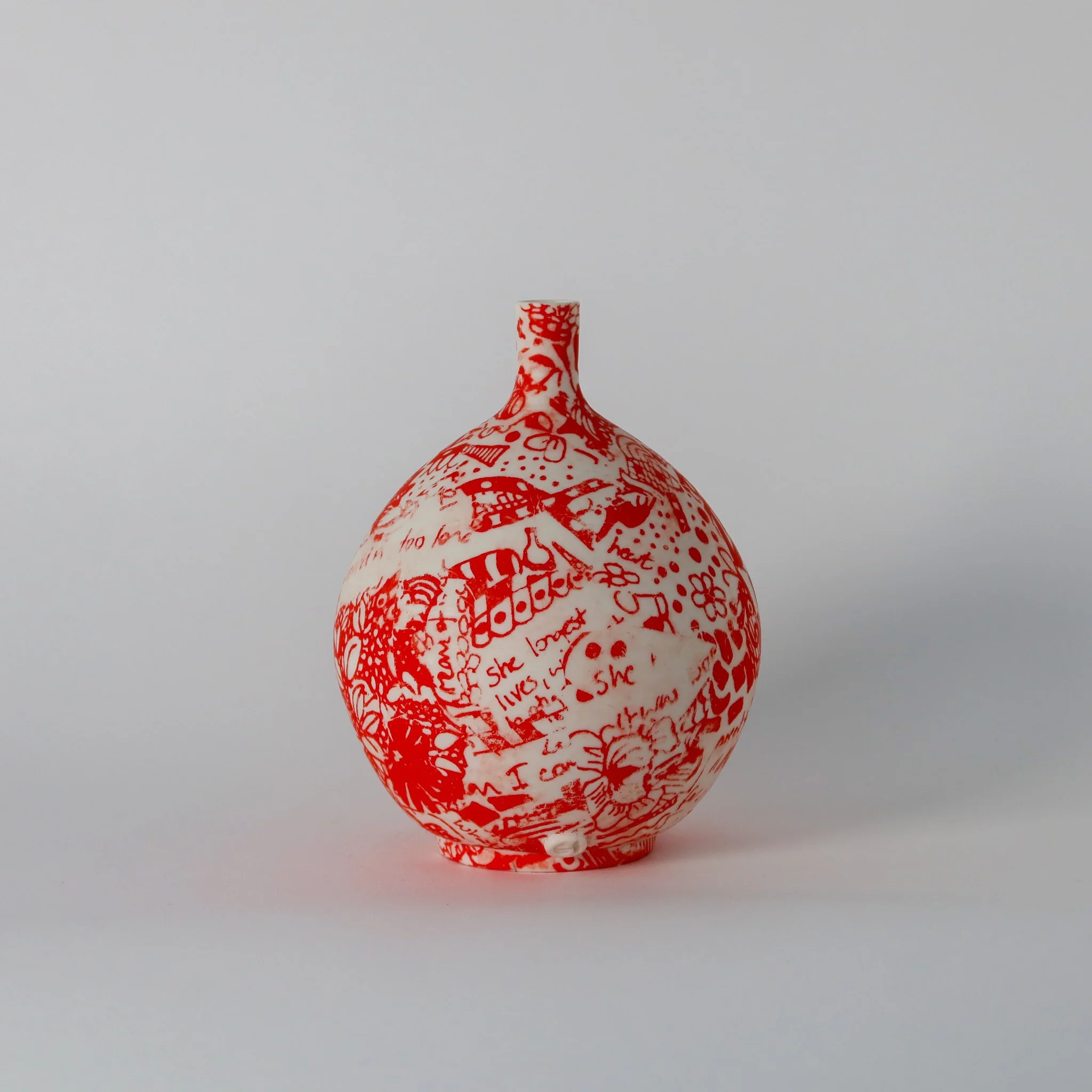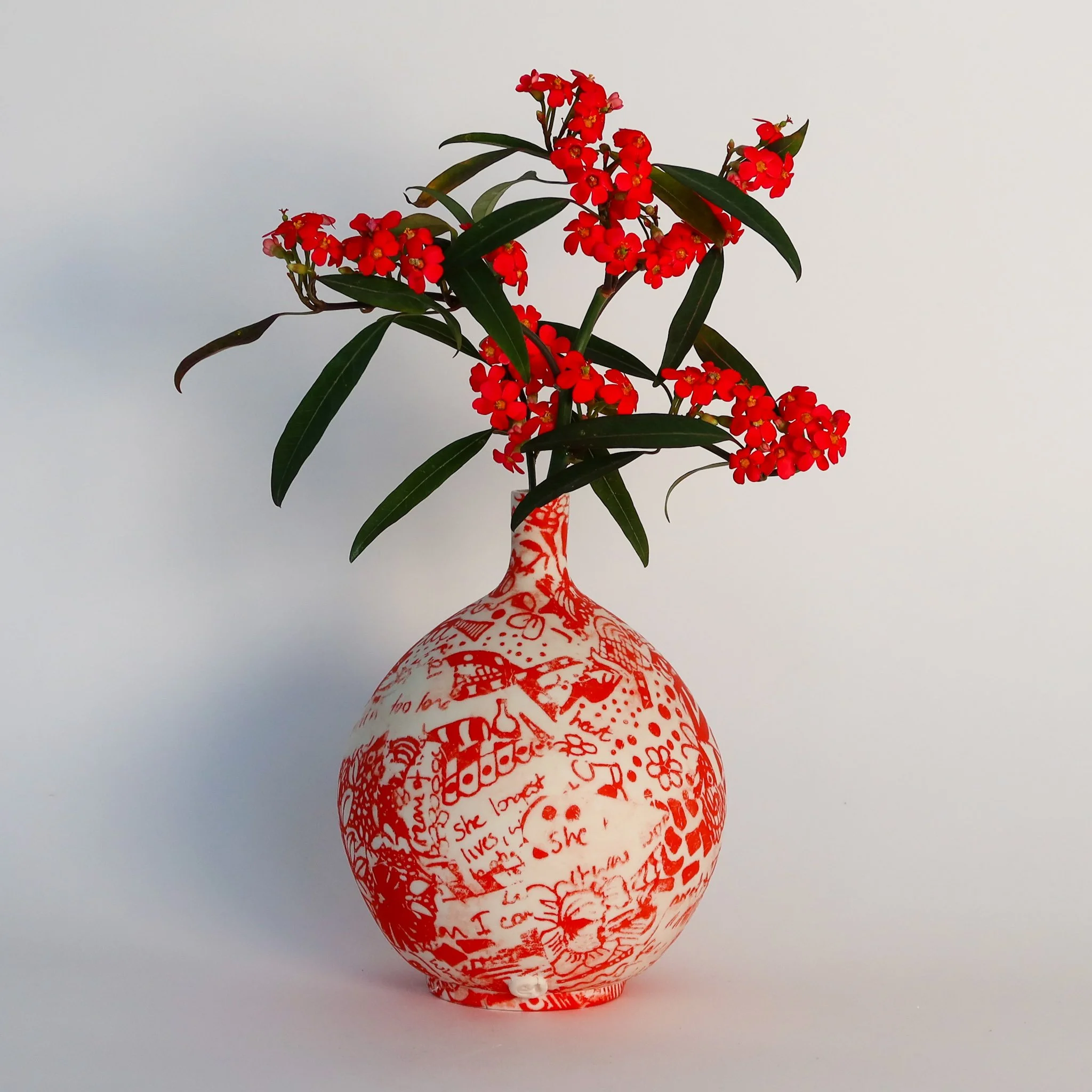 A hand thrown porcelain bottle hand decorated with screen printed drawn details and hand painted words and motifs.
