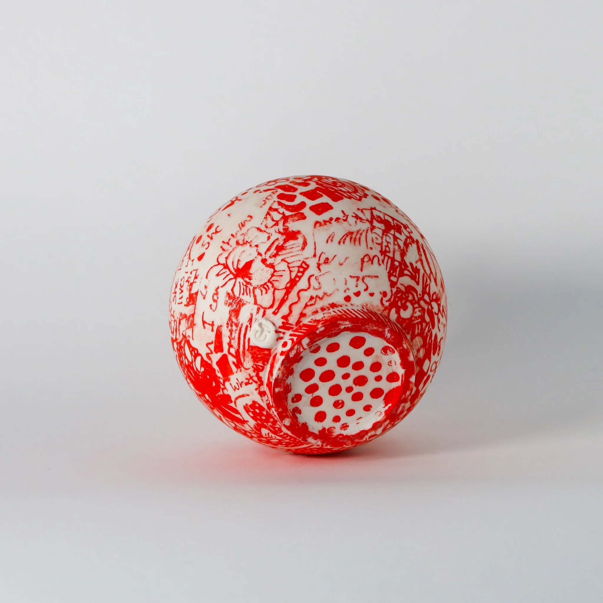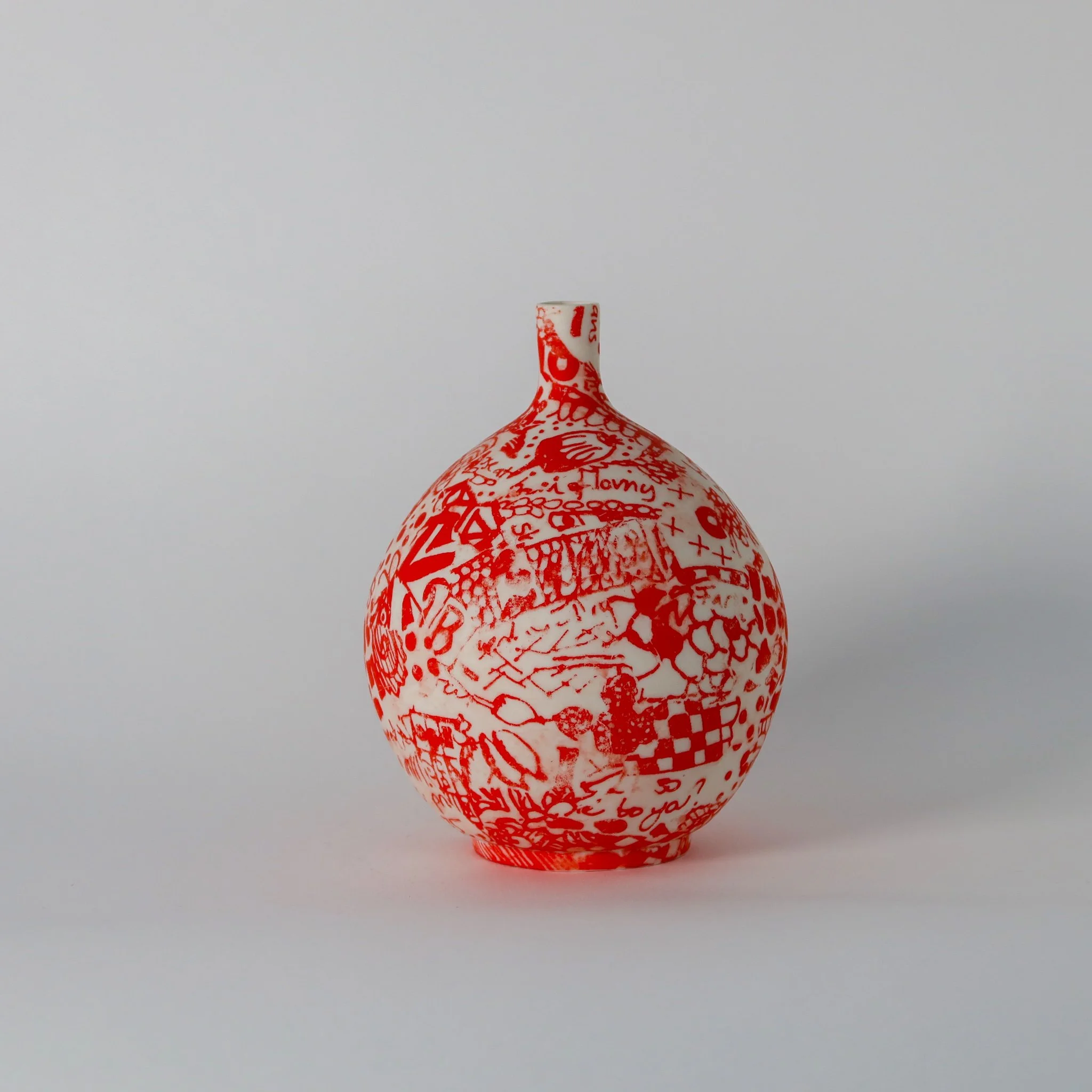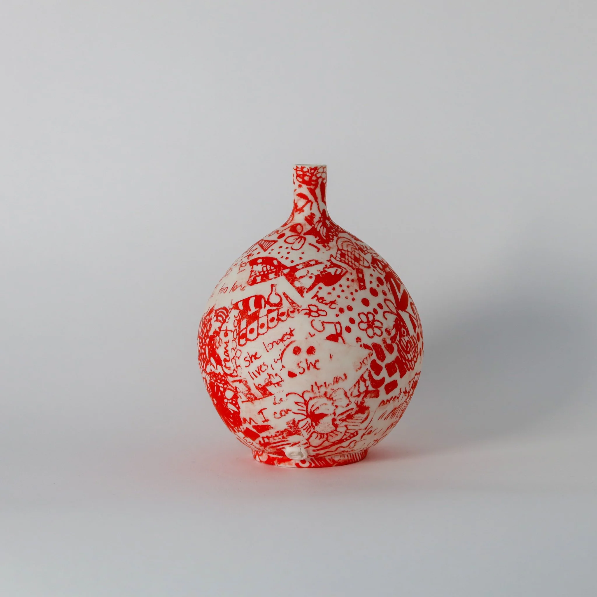 A hand thrown porcelain bottle hand decorated with screen printed drawn details and hand painted words and motifs.