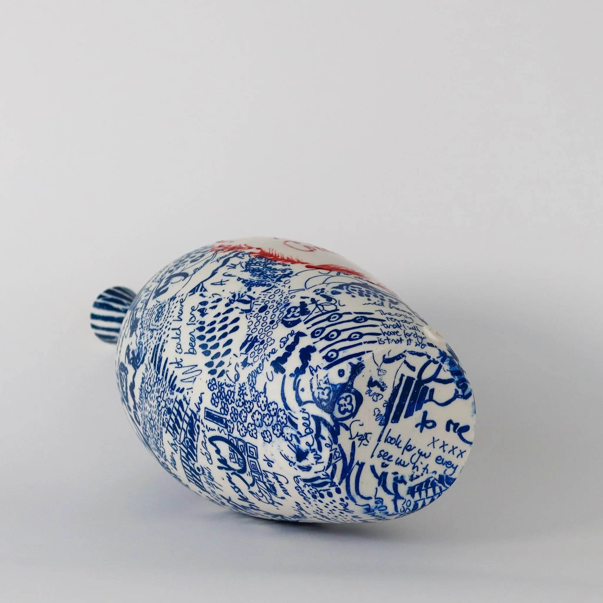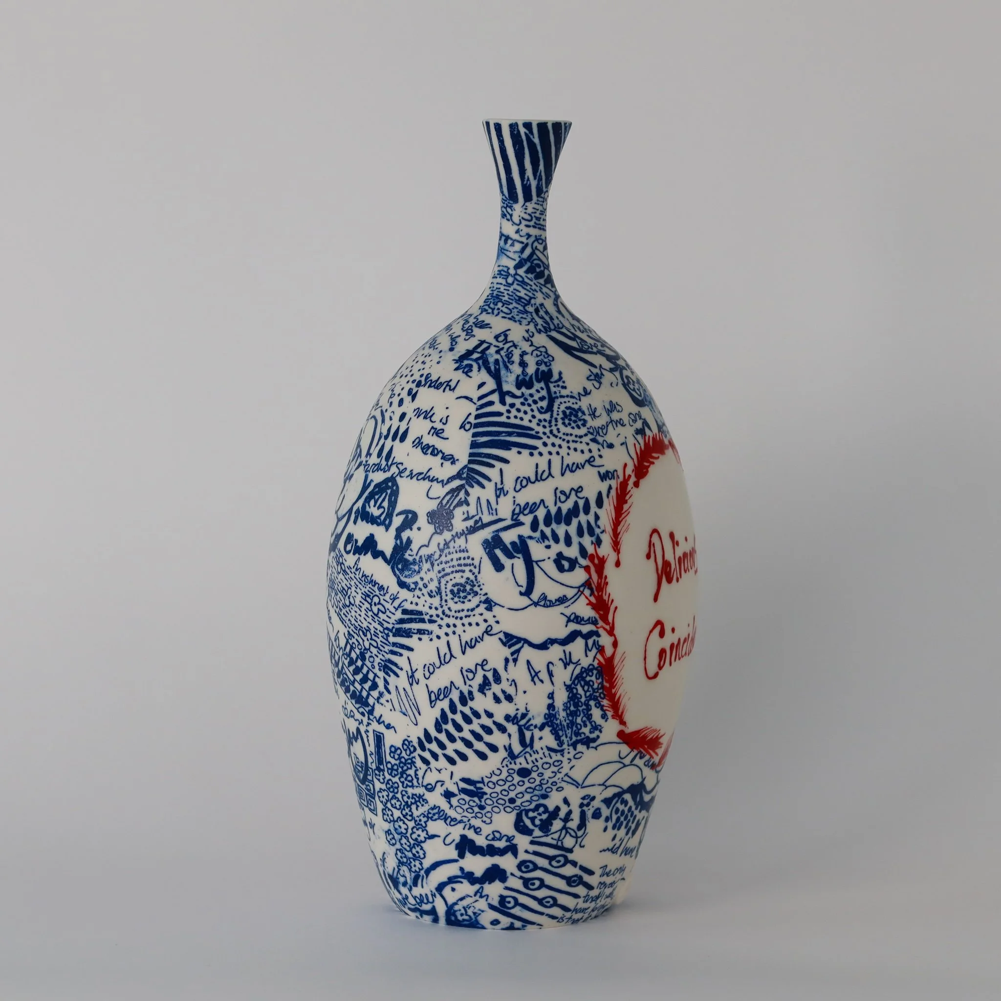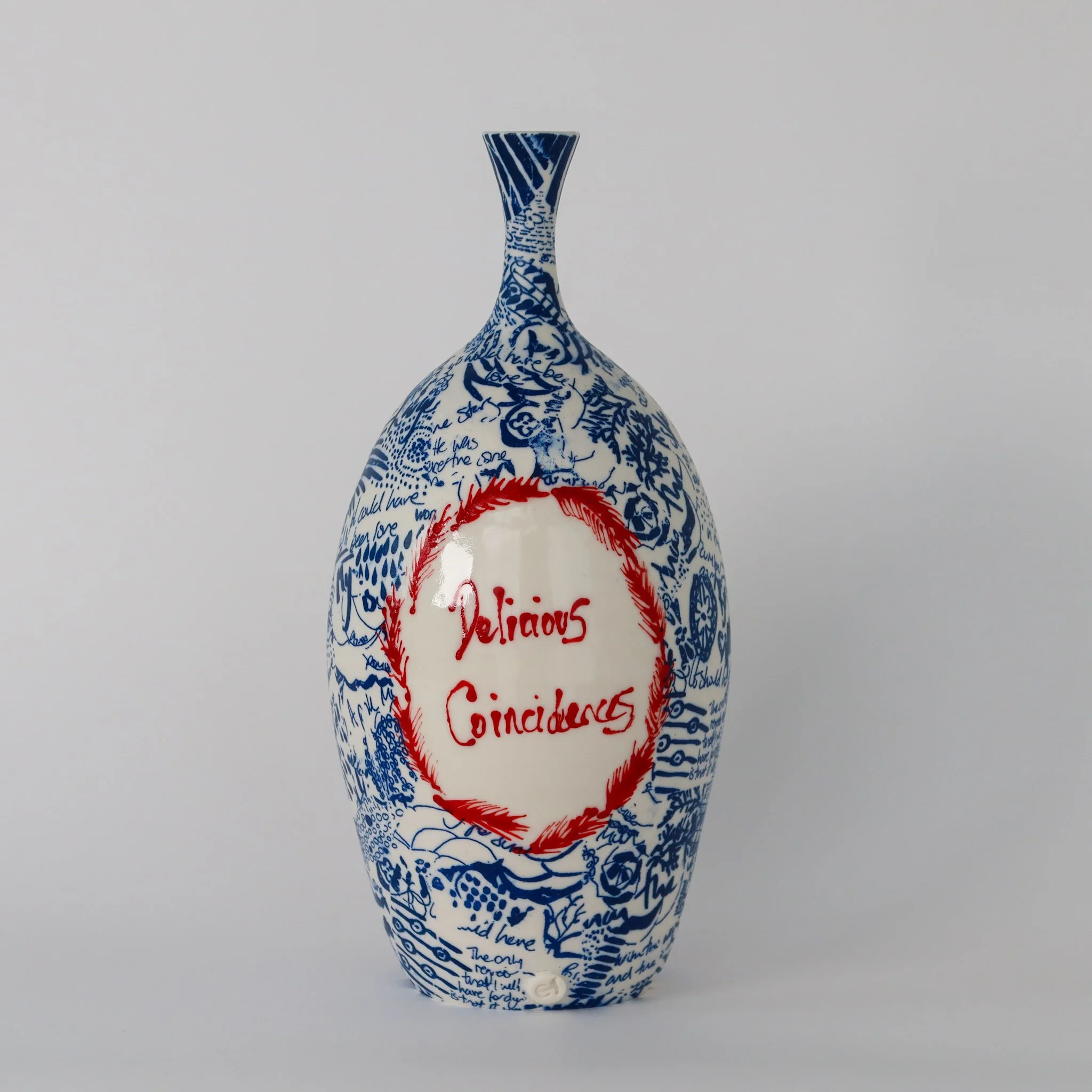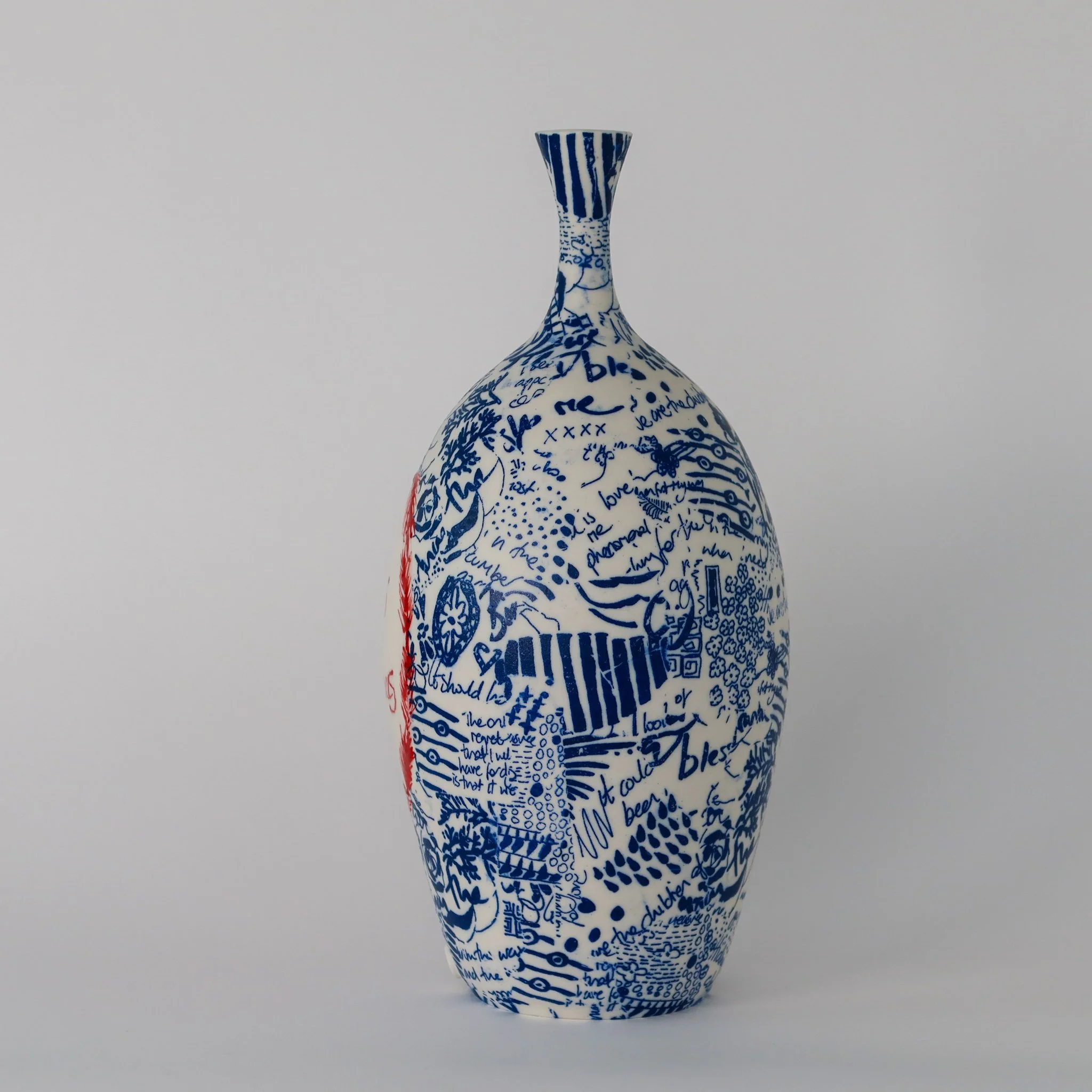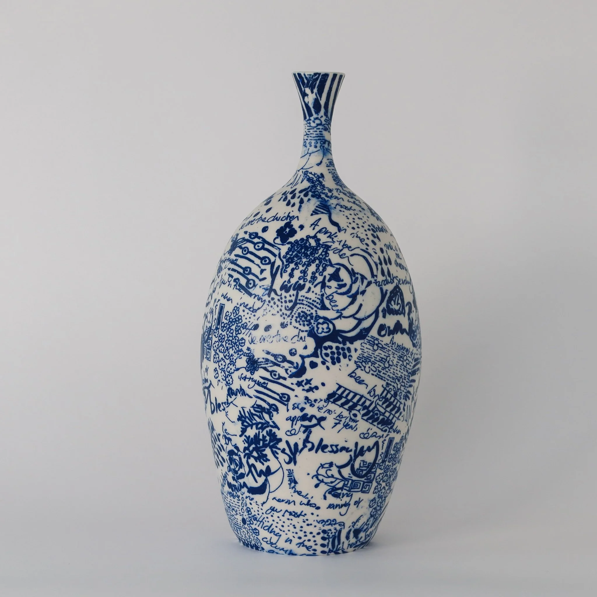 A hand thrown porcelain bottle hand decorated with screen printed drawn details and hand painted words and motifs. Images and texts are taken from a re-reading of Love in the Time of Cholera by Gabriel Garcia Marquez.