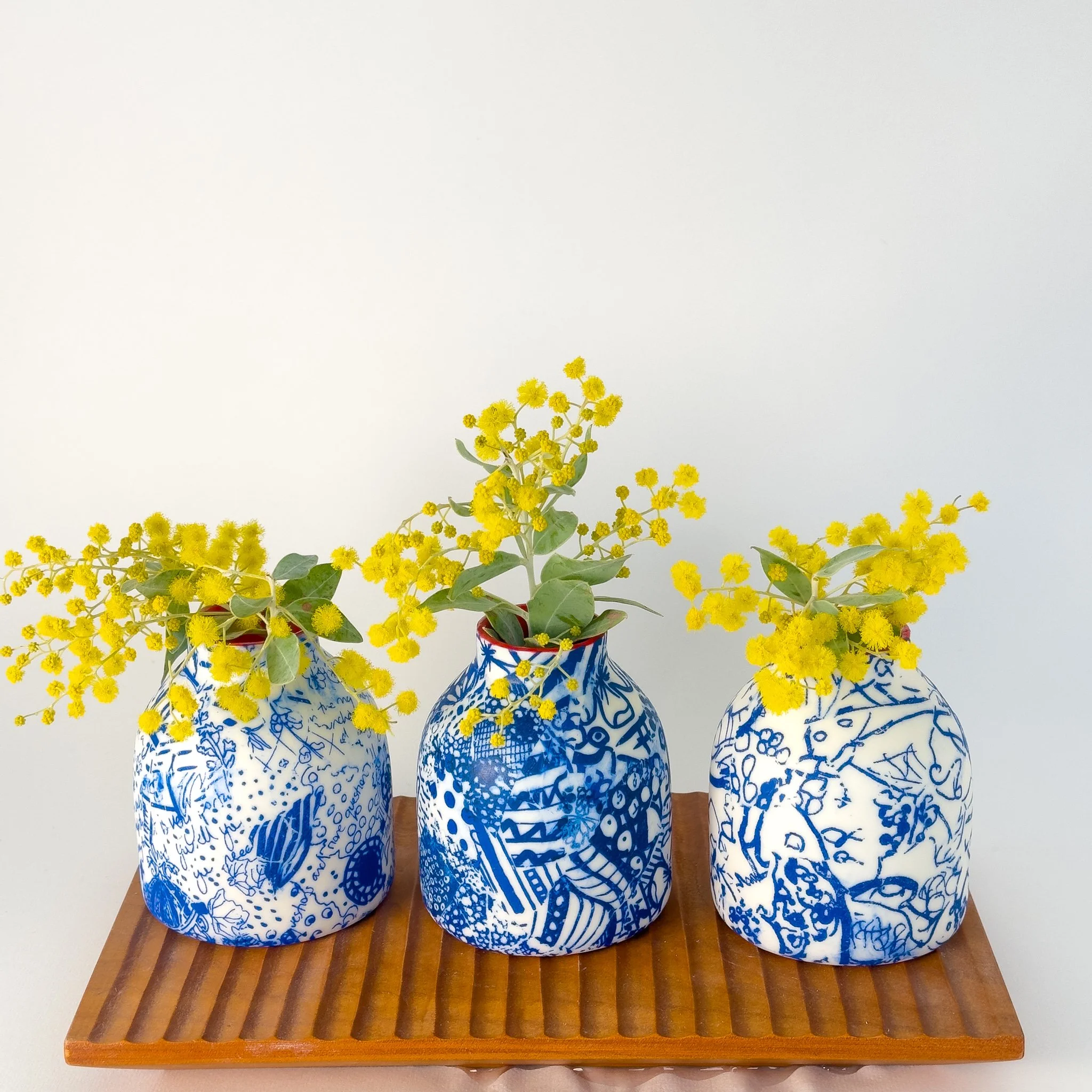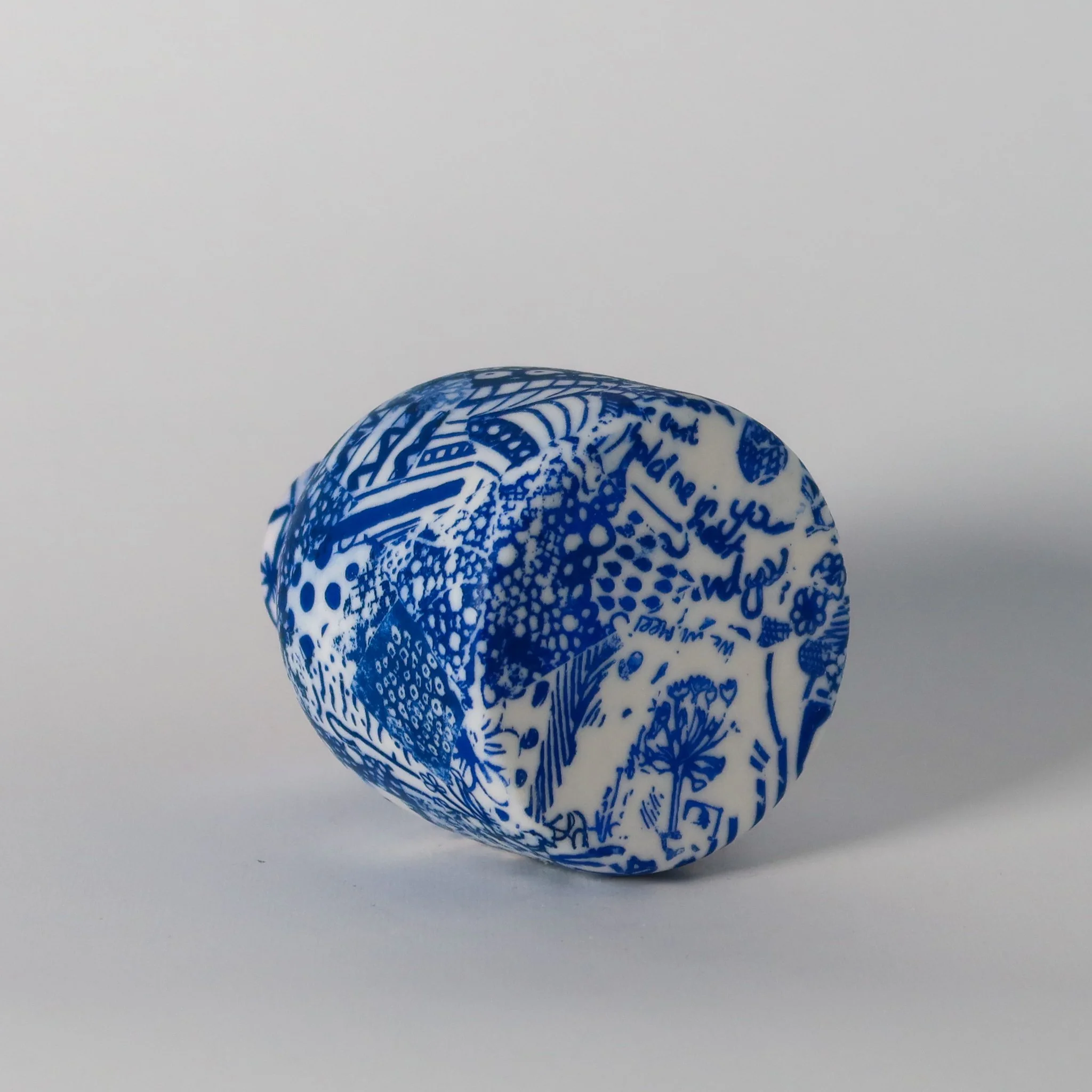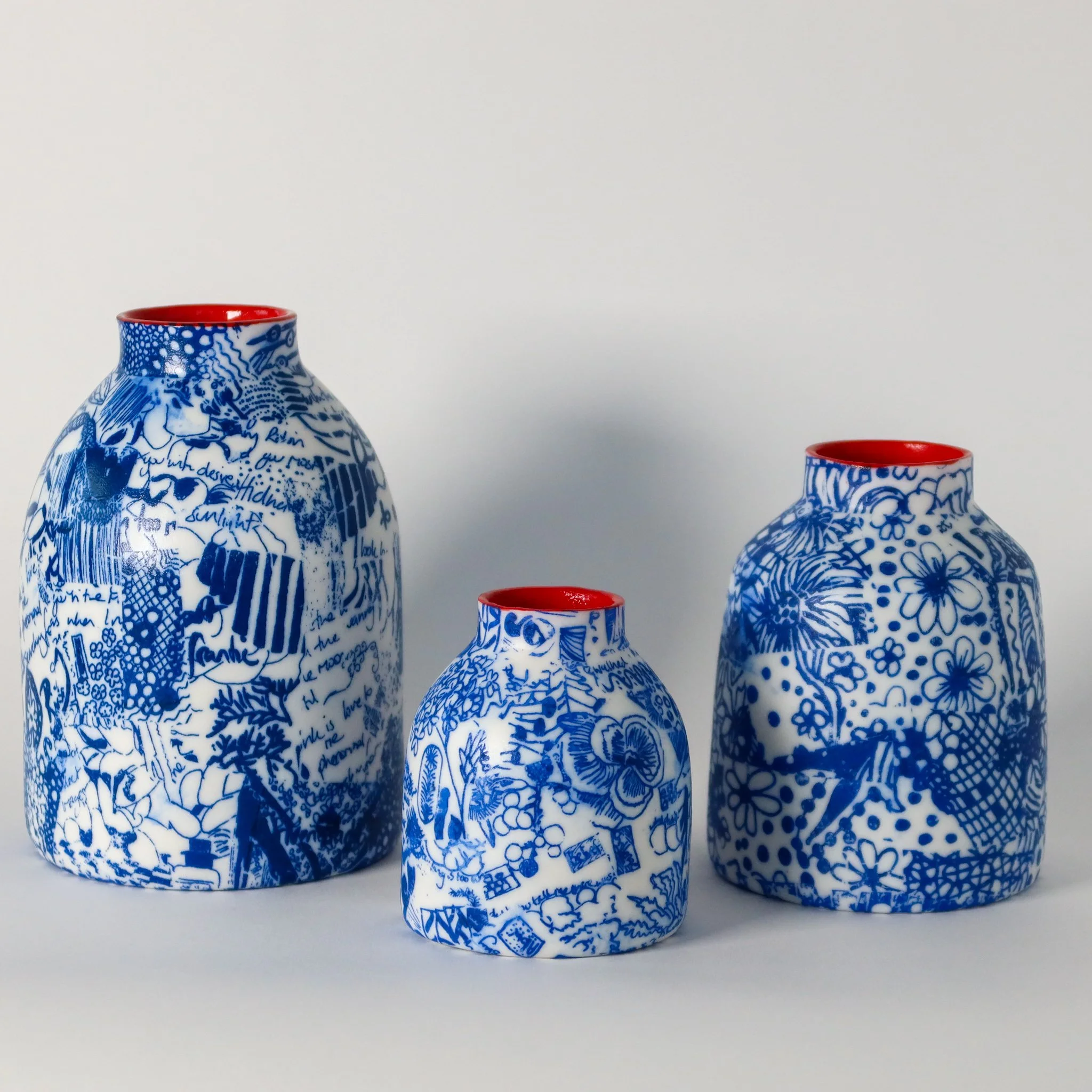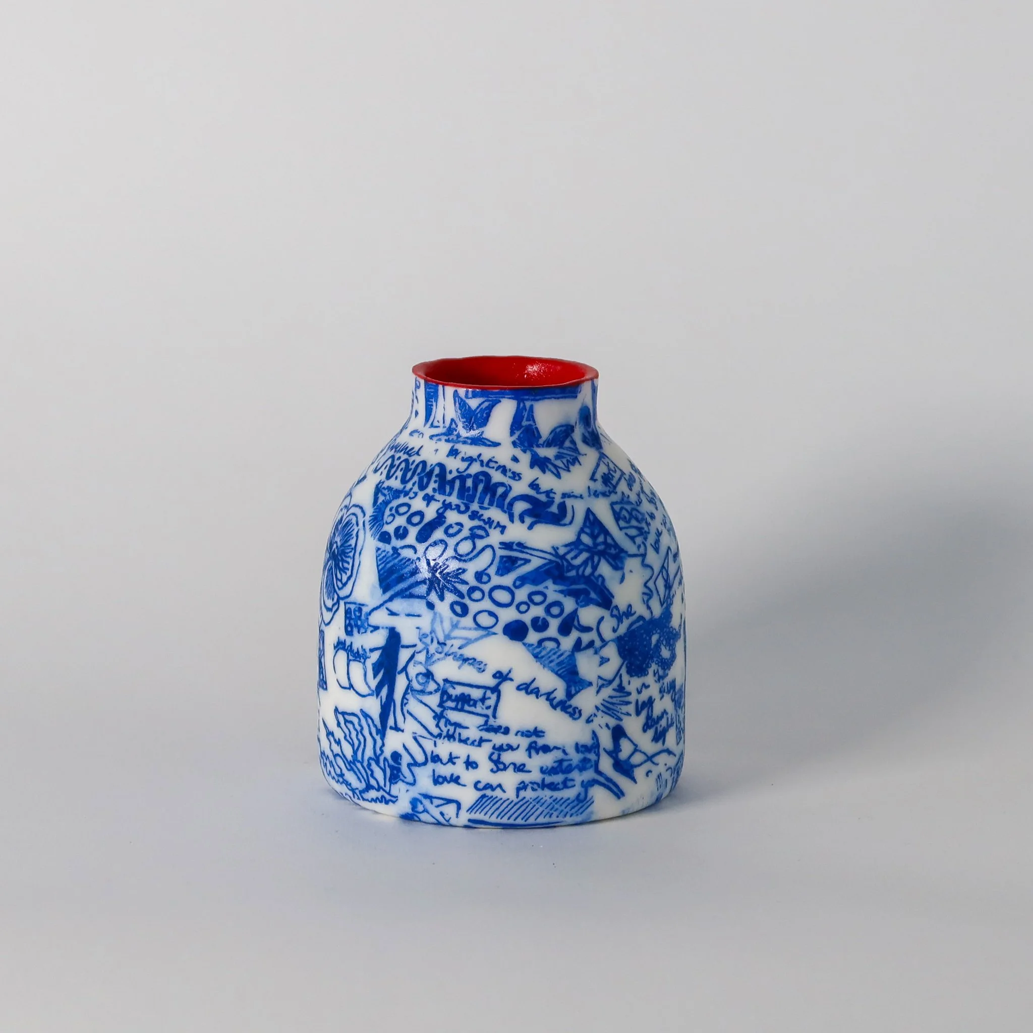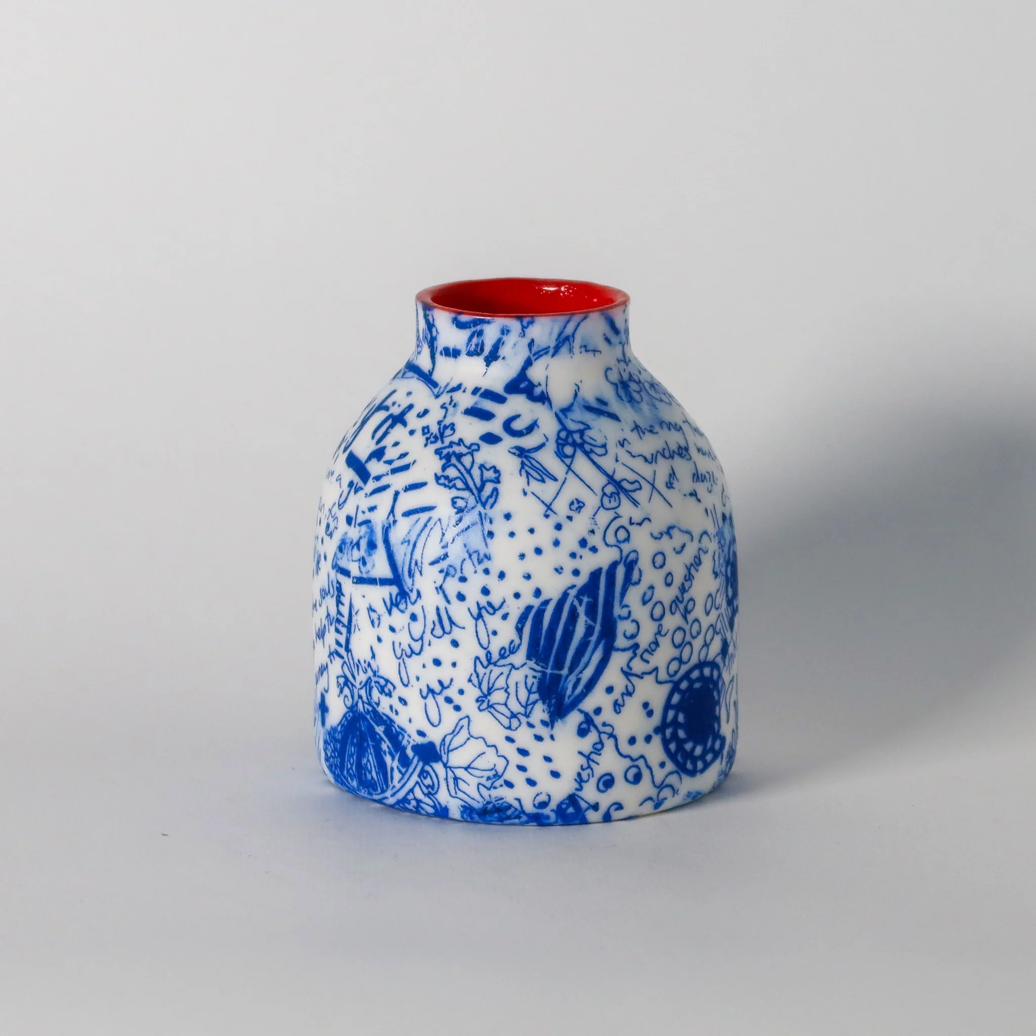 A hand thrown porcelain bottle hand decorated with screen printed hand drawn details