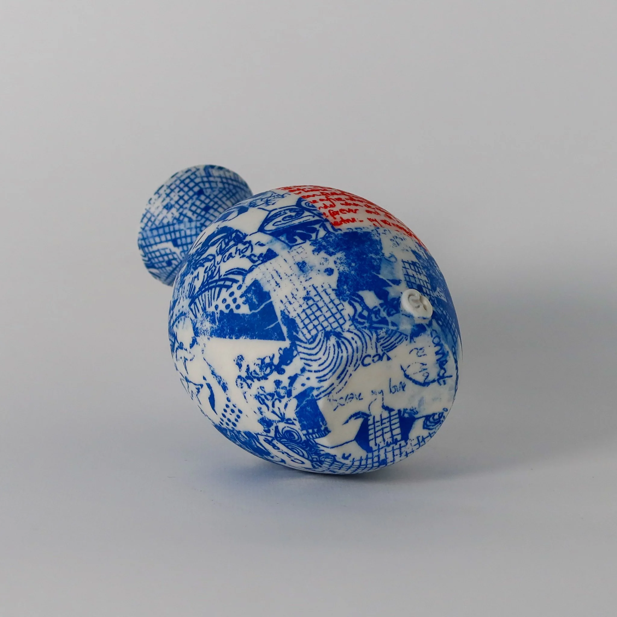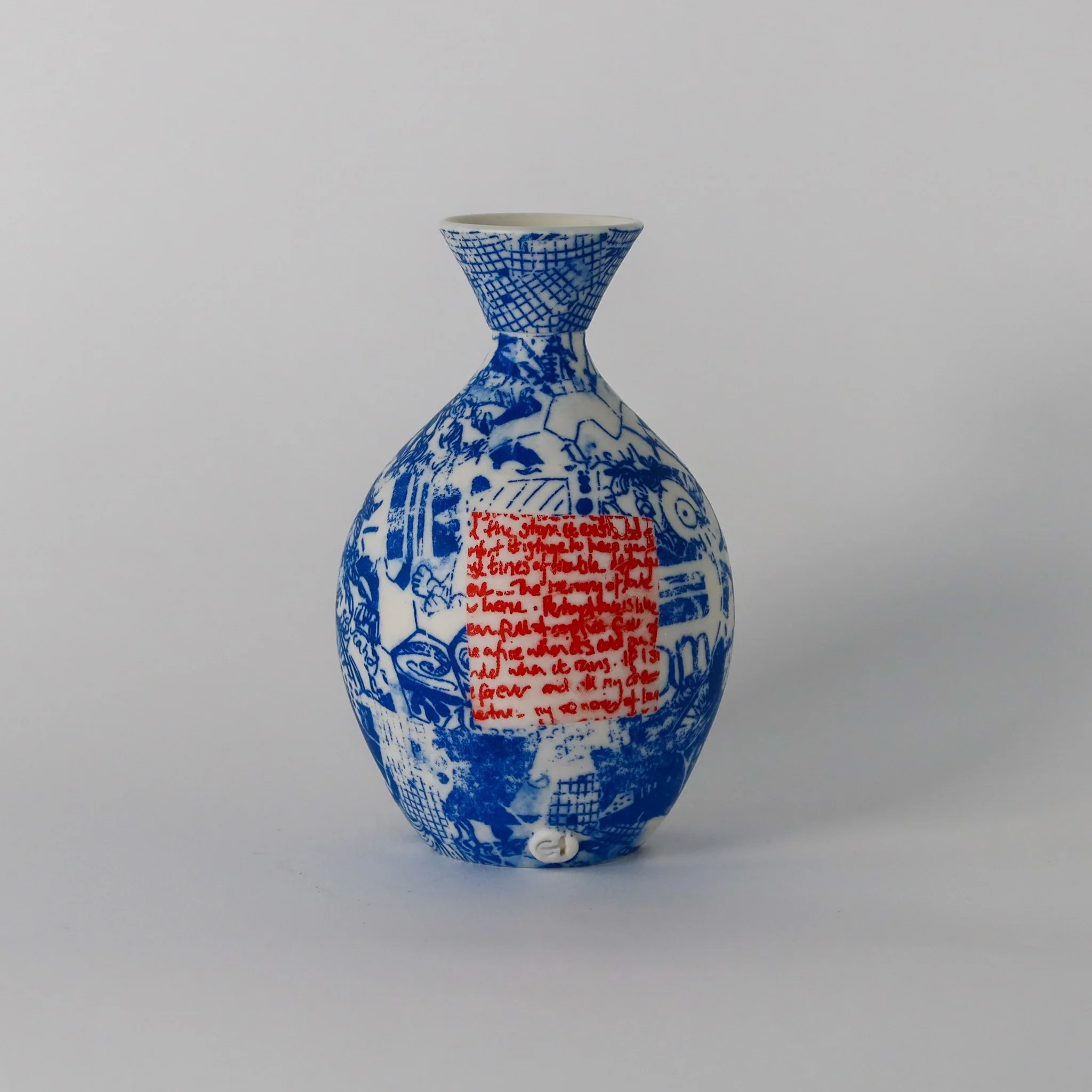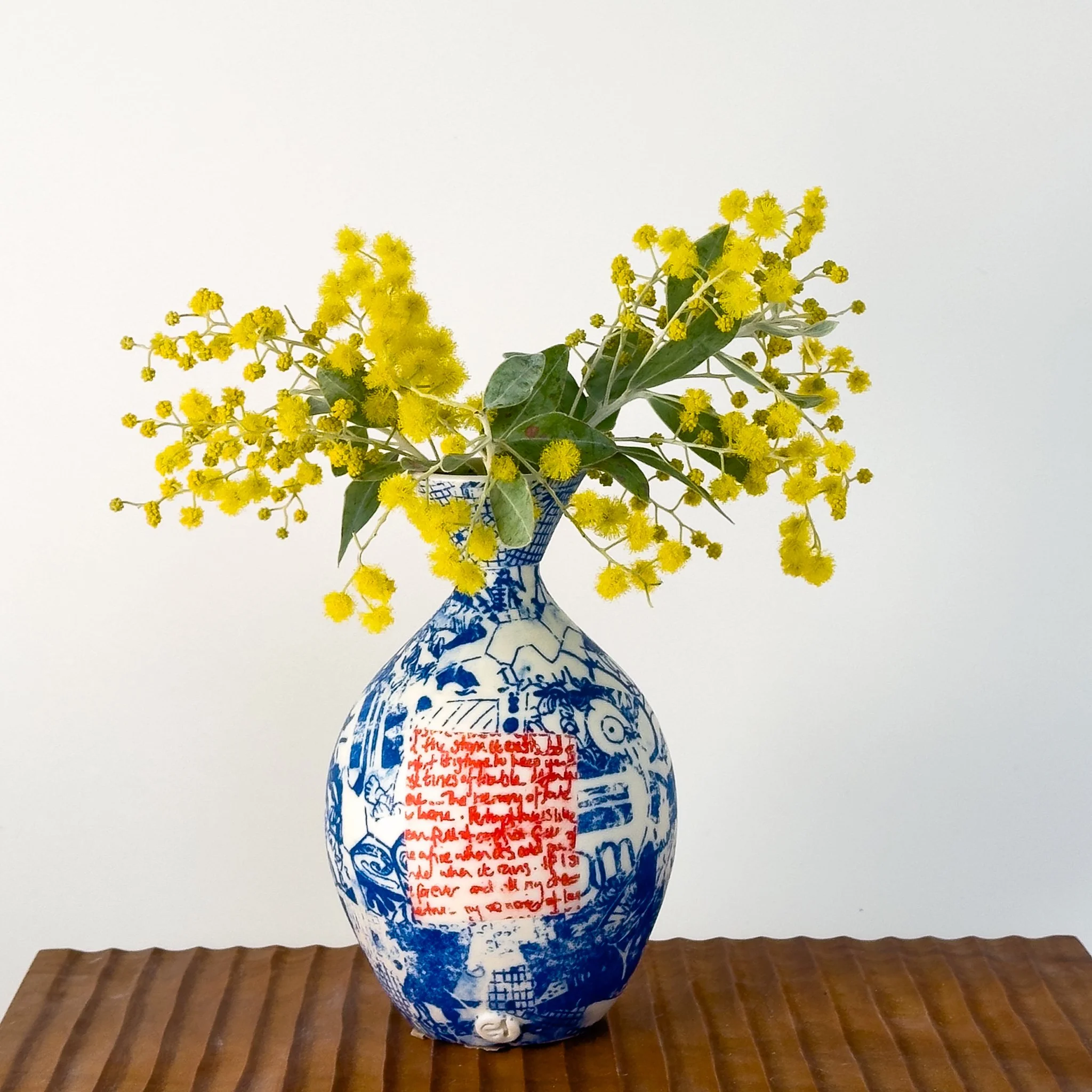 A hand thrown porcelain bottle hand decorated with screen printed drawn details and hand painted words and motifs. Perhaps love is a favorite song written by John Denver and the words in red echo the words in this song