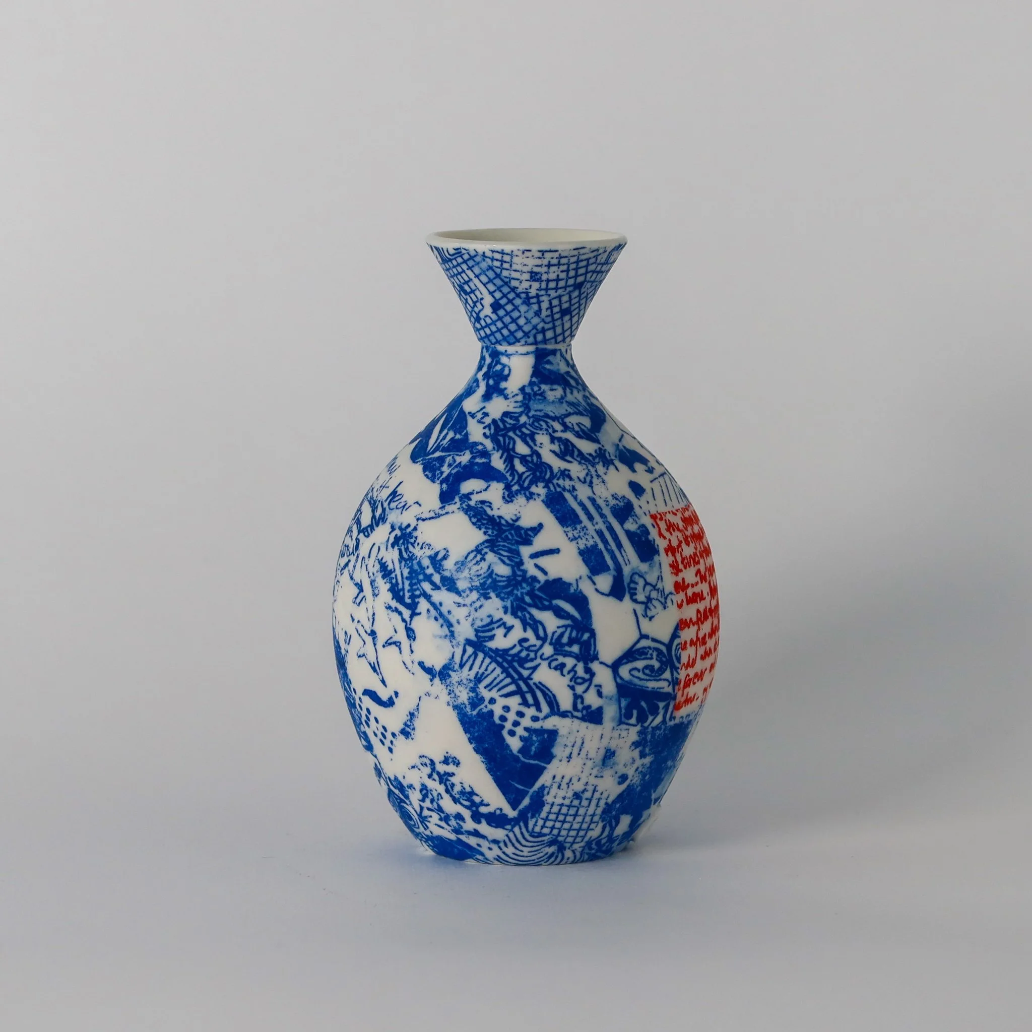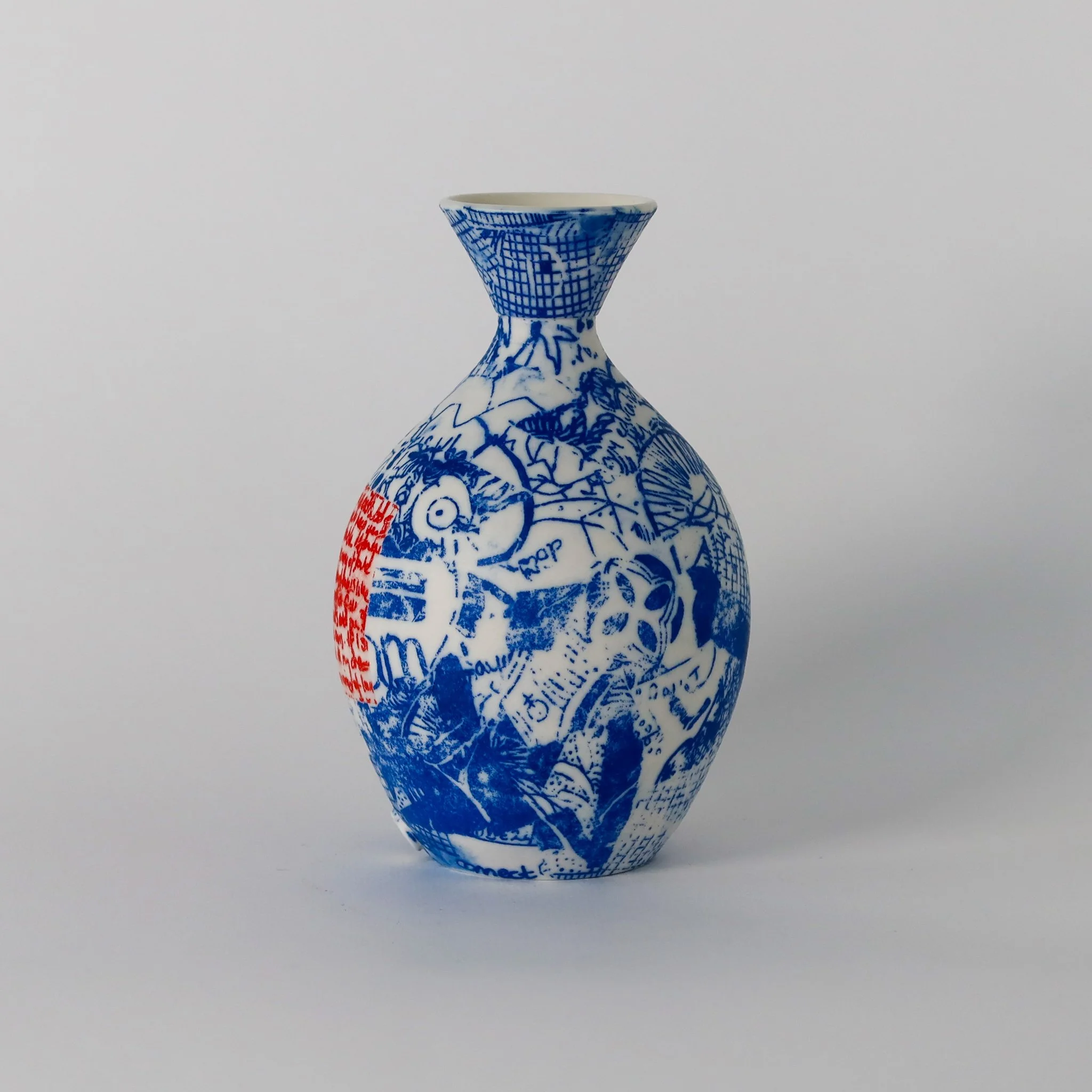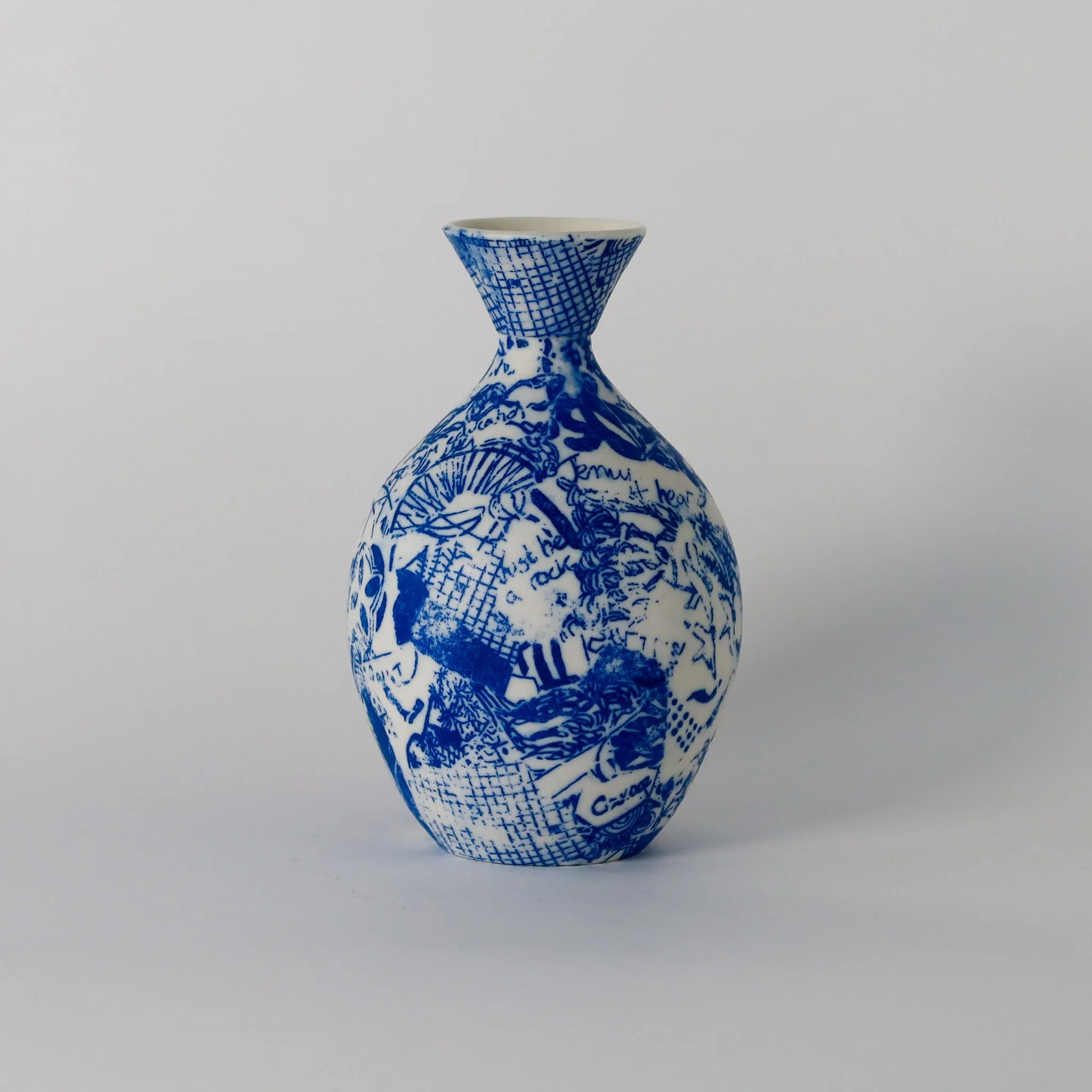 A hand thrown porcelain bottle hand decorated with screen printed drawn details and hand painted words and motifs. Perhaps love is a favorite song written by John Denver and the words in red echo the words in this song