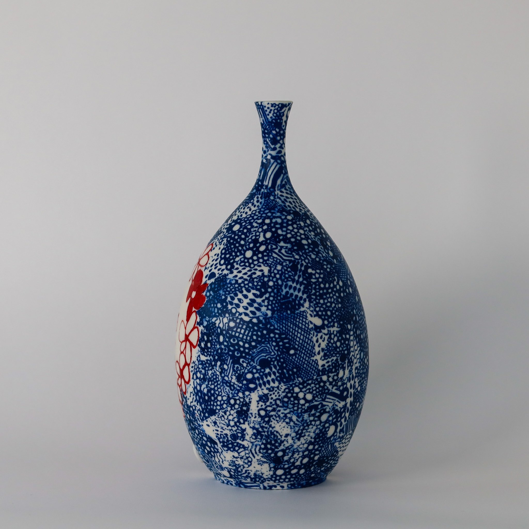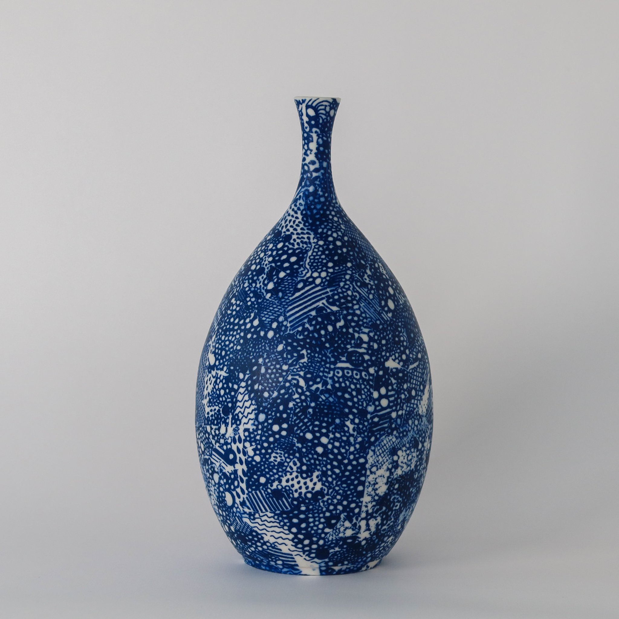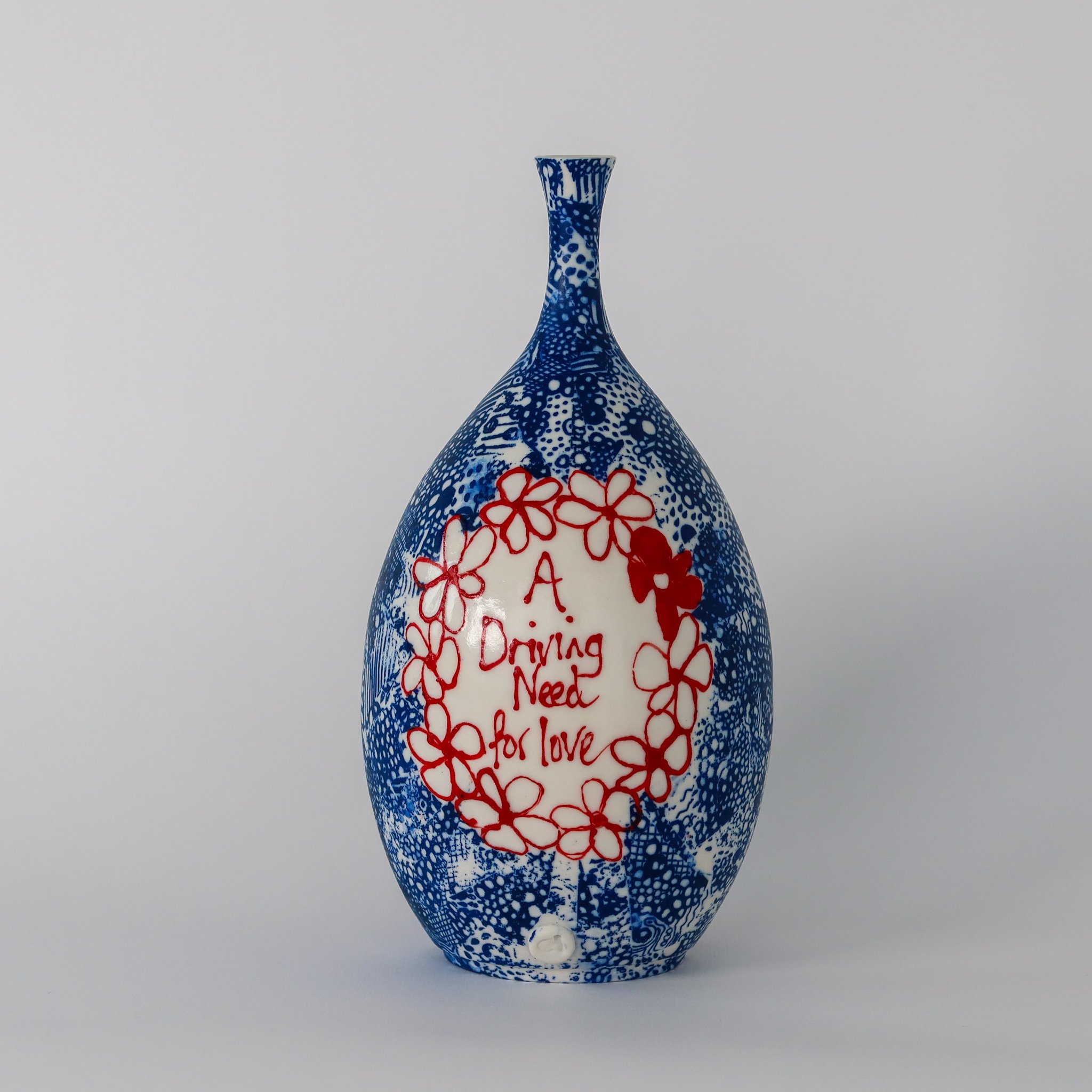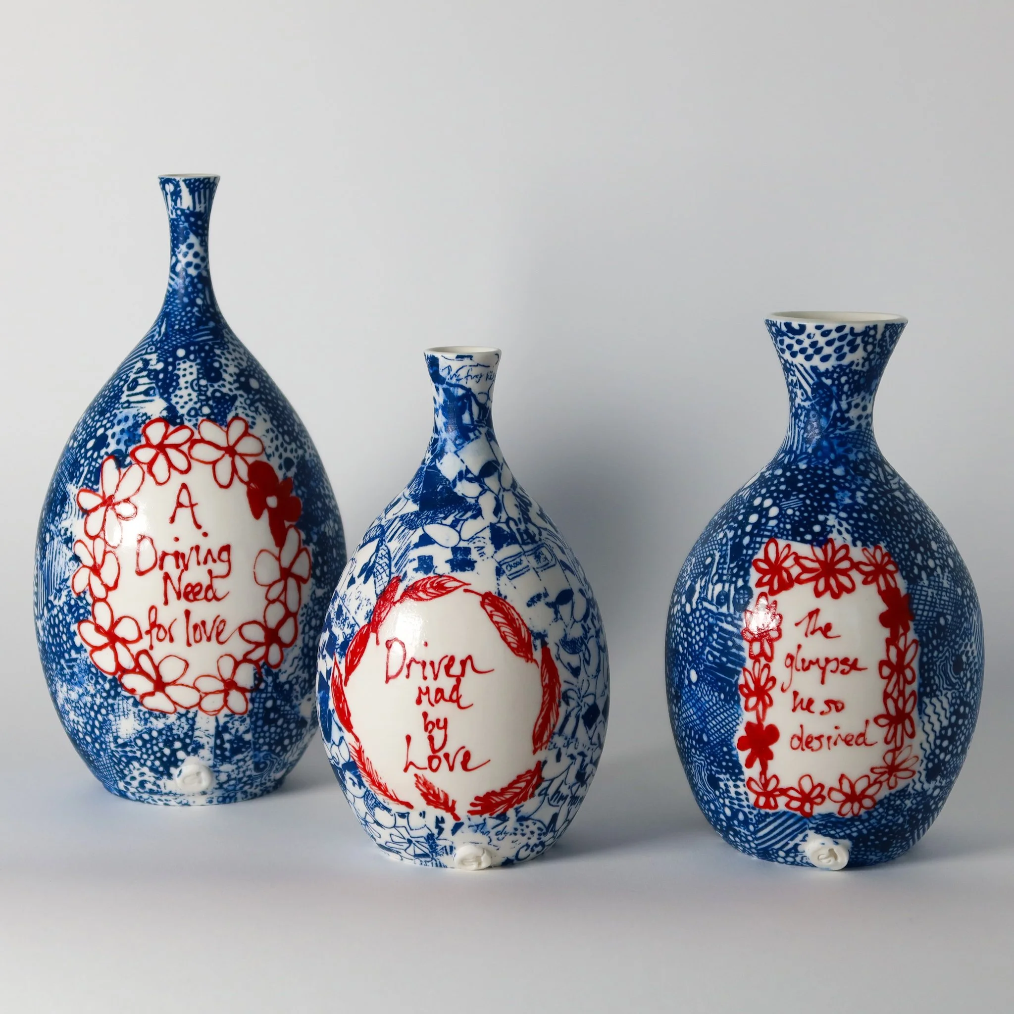 A hand thrown porcelain bottle hand decorated with screen printed drawn details and hand painted words and motifs. Images and texts are taken from a re-reading of Love in the Time of Cholera by Gabriel Garcia Marquez.