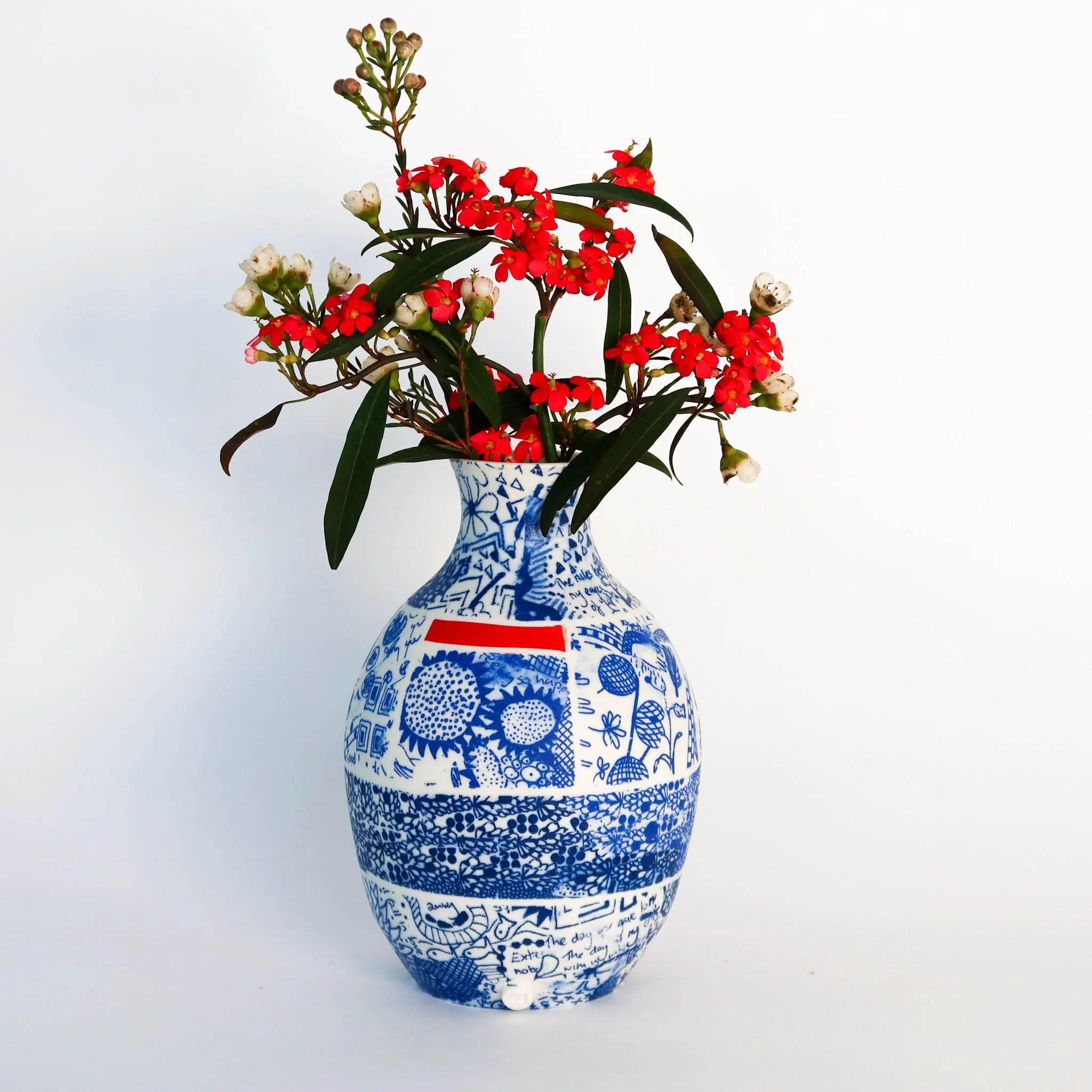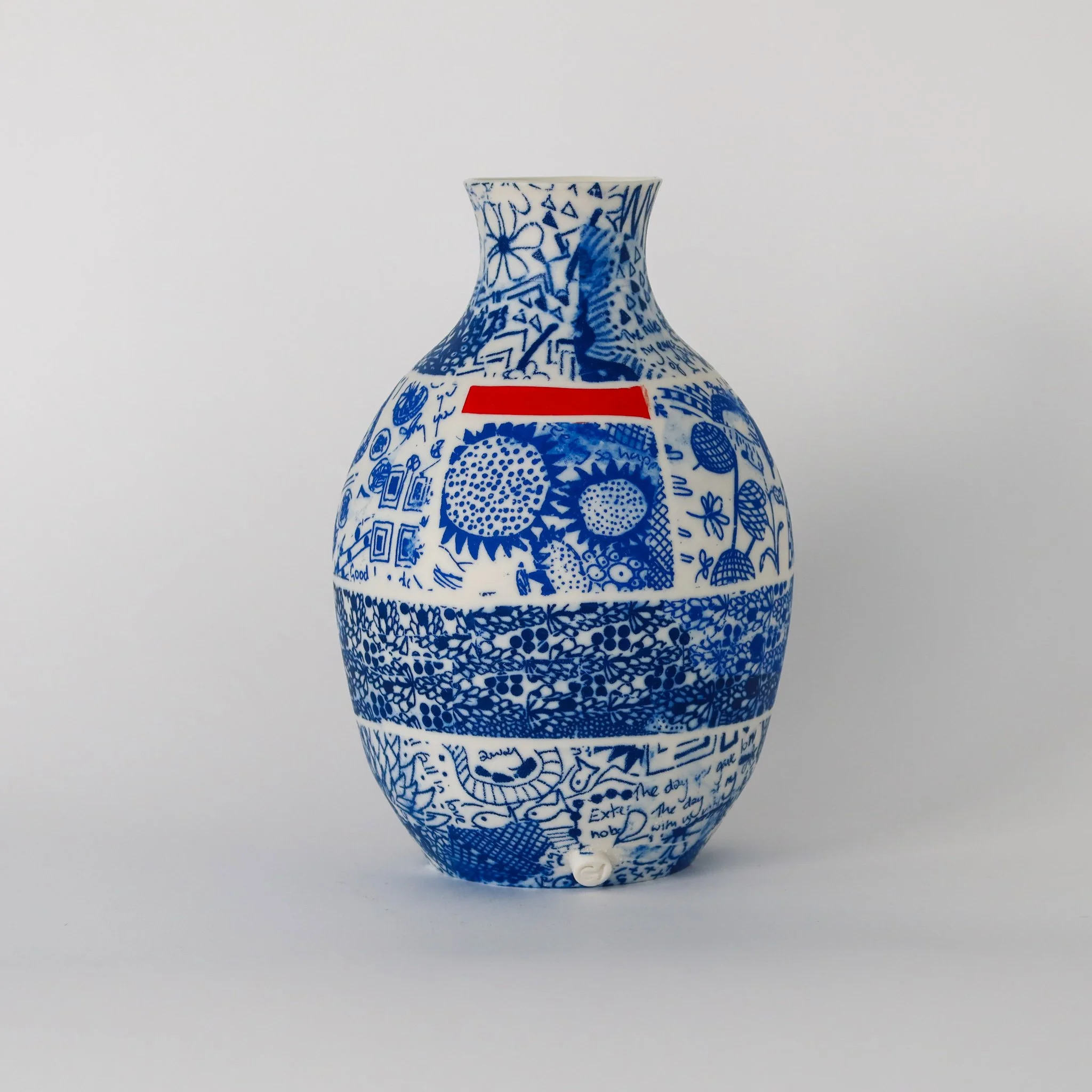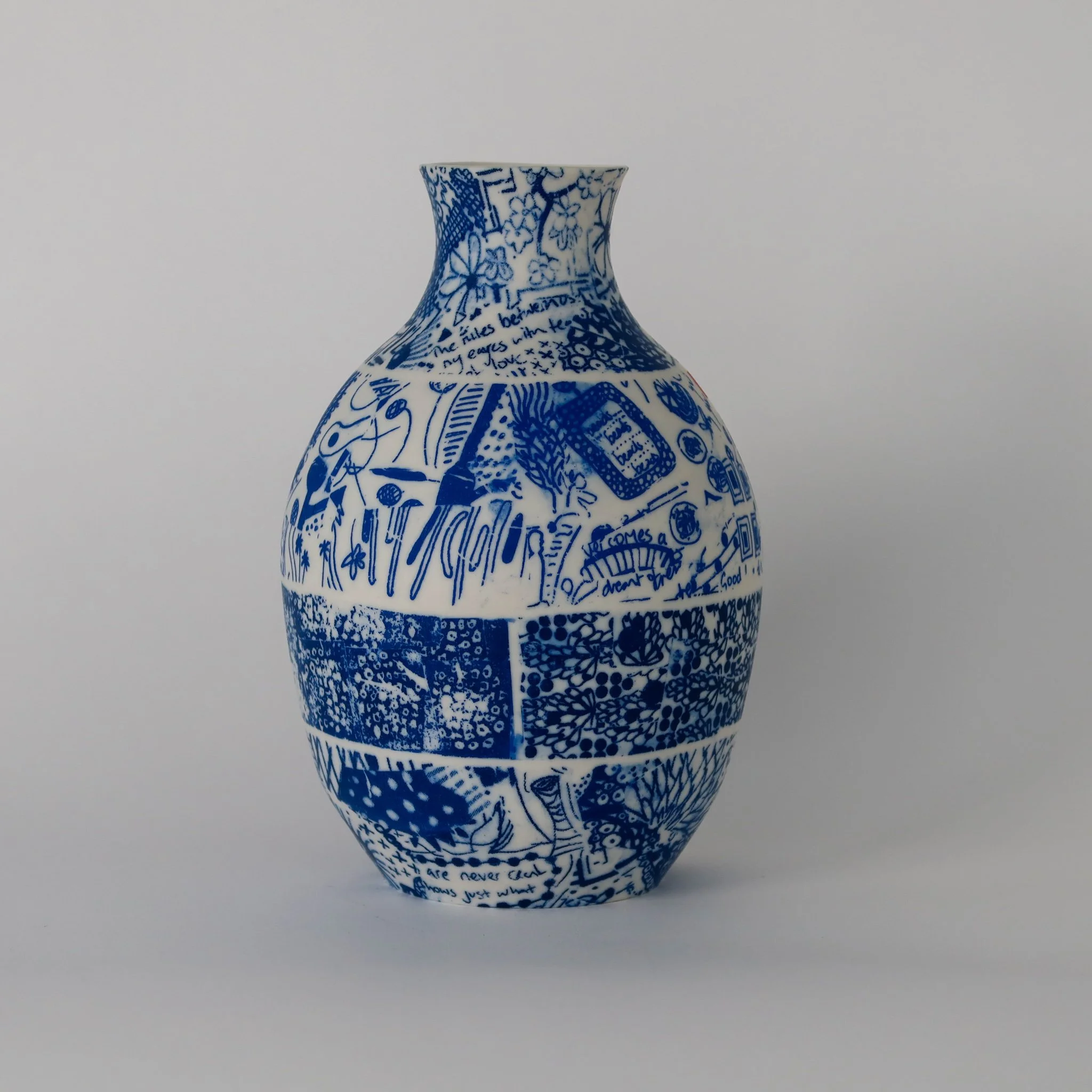A hand thrown porcelain bottle hand decorated with screen printed drawn details and hand painted words and motifs. The words The Miles appear on the surface and come from a poem written in my 20s . The full line of the poem reads ‘The miles between us fill my eyes with tears of love’