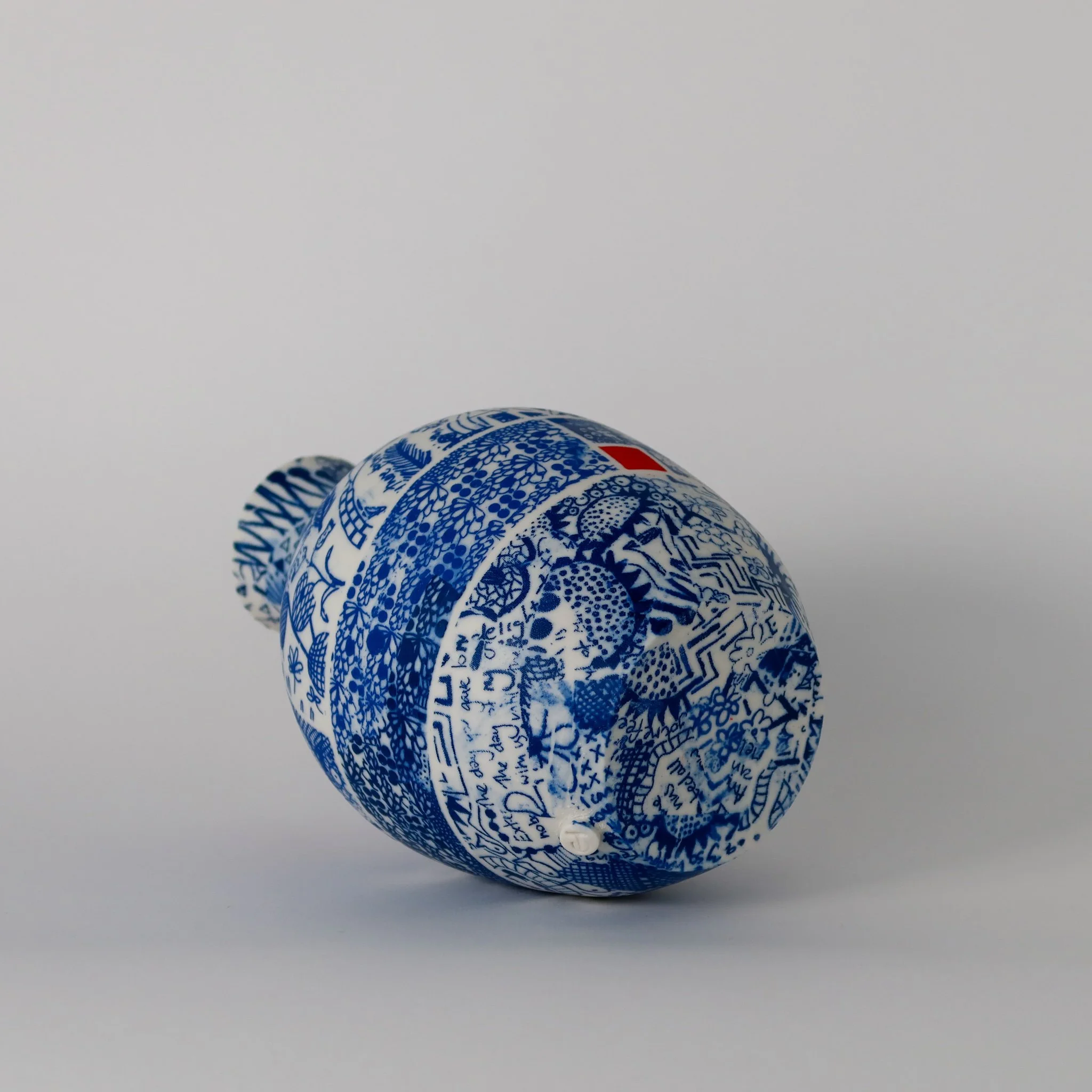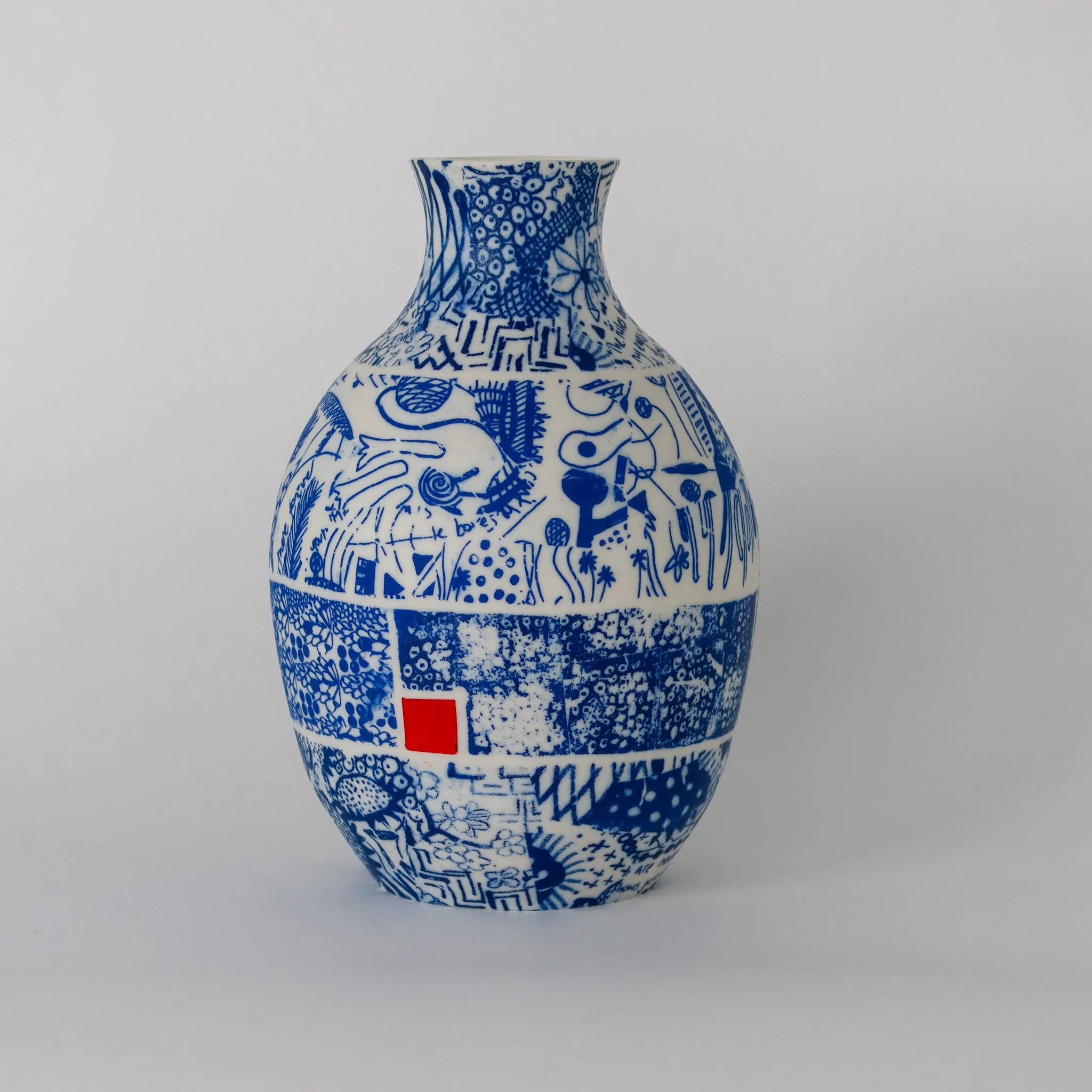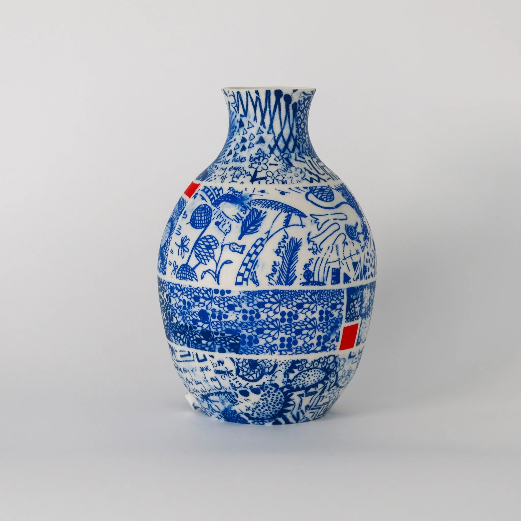 A hand thrown porcelain bottle hand decorated with screen printed drawn details and hand painted words and motifs. The words The Miles appear on the surface and come from a poem written in my 20s . The full line of the poem reads ‘The miles between us fill my eyes with tears of love’